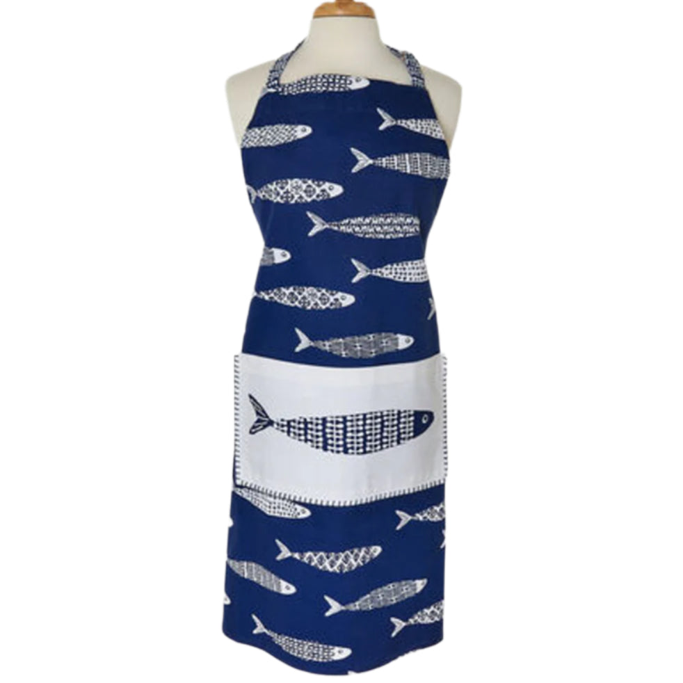 This navy blue apron, made with lightweight cotton fabric, is perfect for any chef or baker. With a rear strap for adjustable fit, it features a nautical school of fish pattern in white on a deep blue background. Keep your tools handy in the large front pocket.