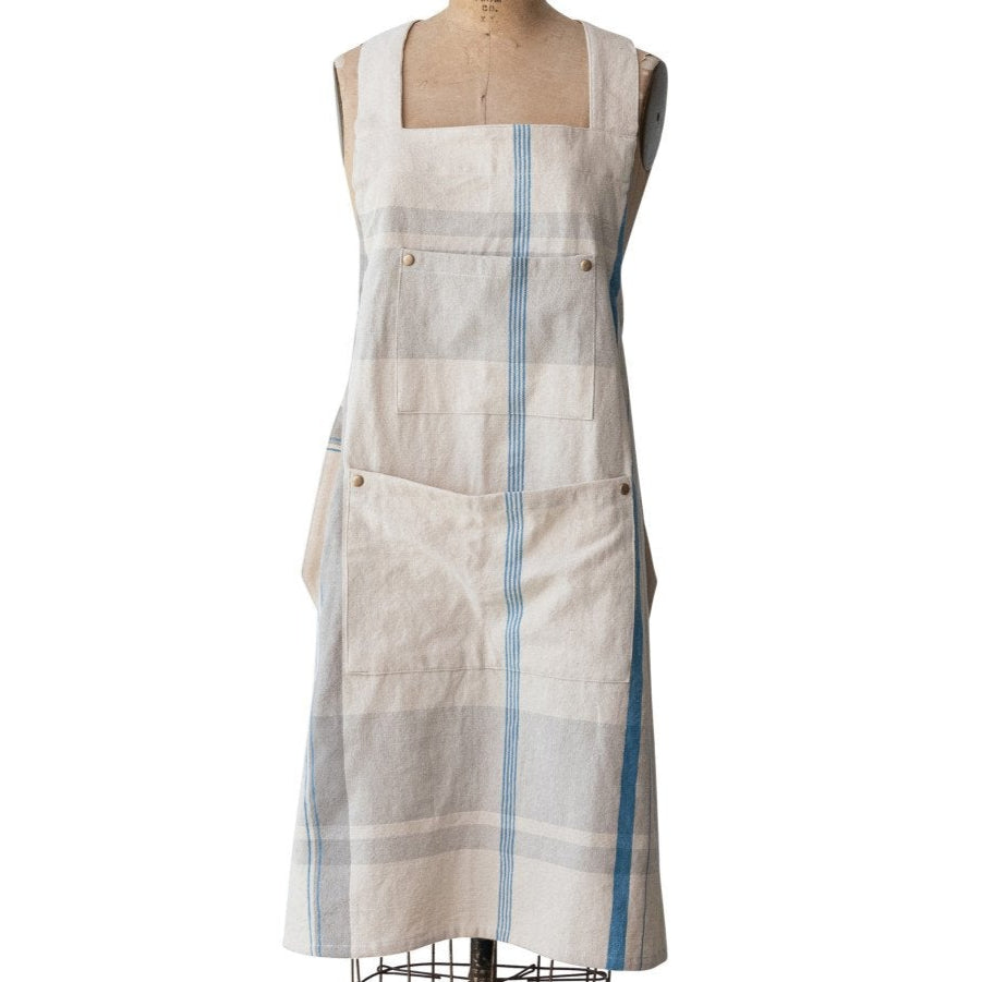 Expertly crafted for the modern kitchen, our Blue & Gray Plaid Cotton Apron is made with 100% cotton and boasts a large blue and gray plaid pattern. With fixed shoulder straps and an adjustable waistband, this apron stays securely in place while you cook. Plus, the spacious front pocket adds convenience to your culinary adventures.
