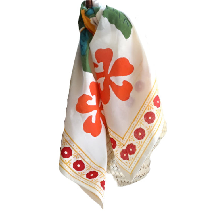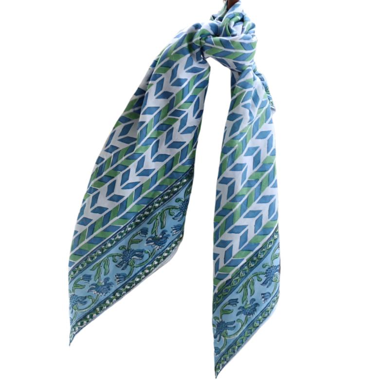 A versatile and fashionable accessory. Tie one around your neck, wear as a head scarf or tied around the handle of your tote. Hand block-printed on soft cotton voile in Jaipur, India. Machine wash, tumble dry low. 26" square