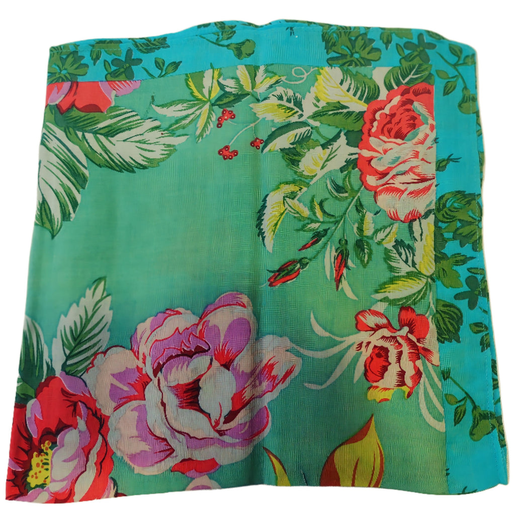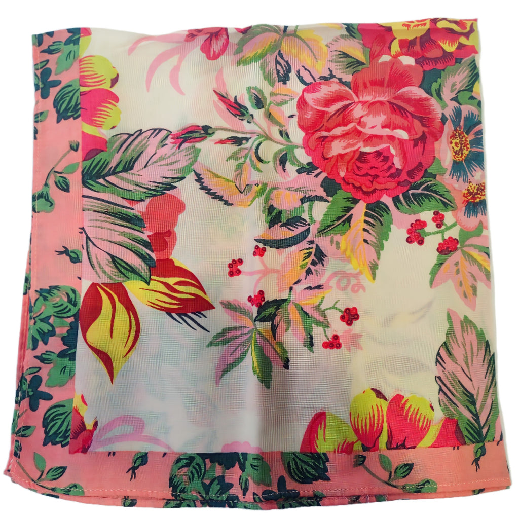 This fave looks like your Summer: fresh, colorful, and incredible! This bandana featuring a lush floral multi-pattern with an ornate contrast border will be your most versatile summer accessory. Tie it around your face, use it as a neck-tie, or hair tie any way you'd like. 21" on all sides. Made in India.