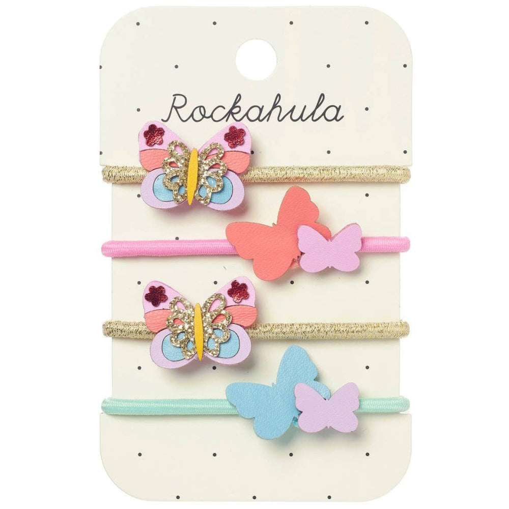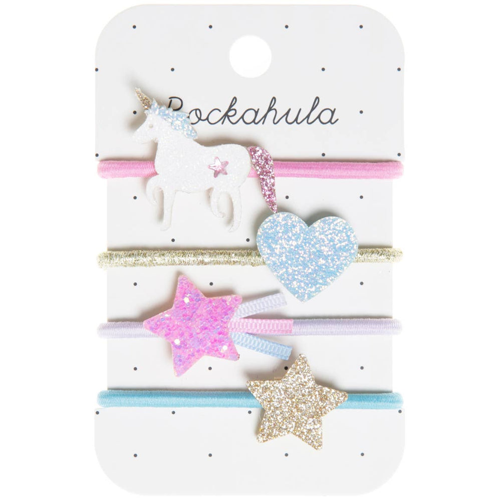 All things fun and fabulous adorn these sets of four ponies! Fun glittery charms decor each hair tie on brightly colored elastics for a cute look that pops! Made with recycled felt, glitter, and polyurethane.