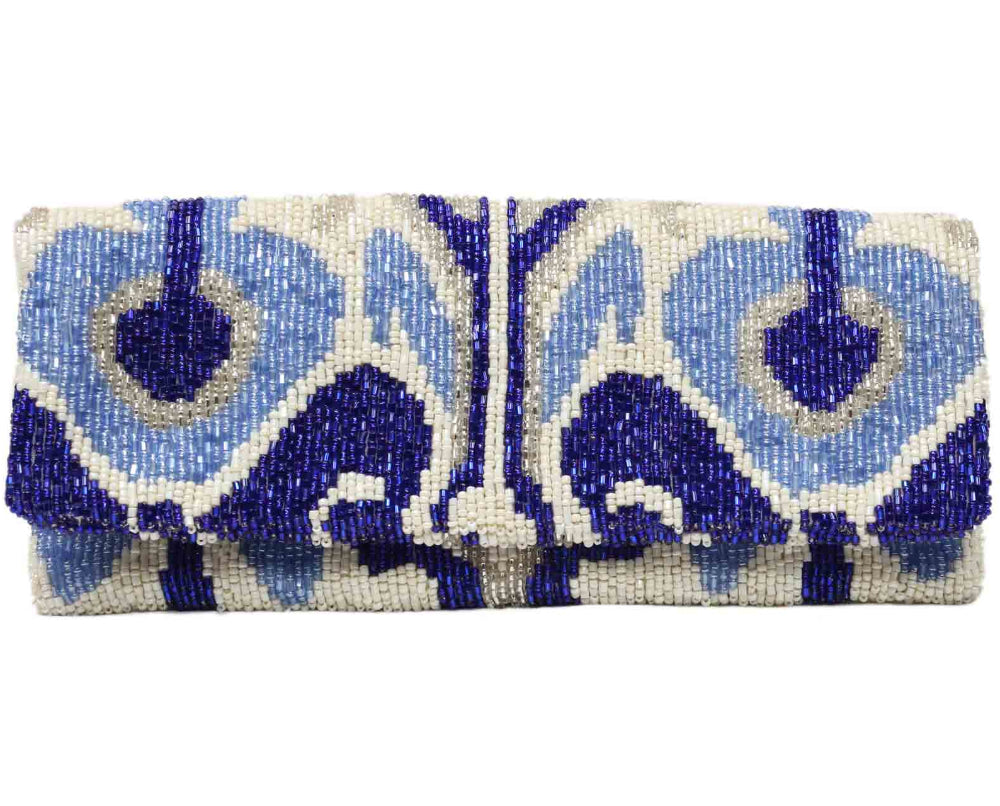 This Tiana Designs clutch bag is 100% handmade and hand-beaded. Features luxurious satin lining and a interior pockets for cards and other valuables. Magnetic clasp opening with inner zipper. Measures 6.5" x 4.25".