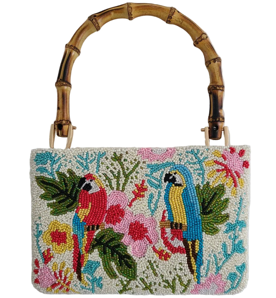 This Tiana Designs mini purse is 100% handmade and hand-beaded. Features luxurious satin lining, a small interior pocket for cards and other valuables, and a cut-out sealed bamboo swing handle. Magnetic clasp opening. Measures 6.5" x 9".