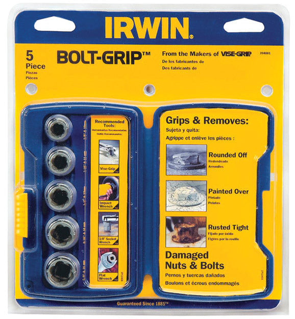 The Irwin Bolt-Grip Bolt Extractor Base Set contains five of the most commonly used bolt extractor sizes to easily remove rounded off, rusted-over or painted-on bolts. Bolt-Grip bolt extractors feature reverse spiral flutes that bite down on the bolt to ensure maximum gripping power to break free bolts in almost any condition. Constructed of high carbon steel, they are designed for increased durability and extended tool life. The universal lobular design works with all fastener types and the 3/8" square drive can be used with impact wrenches and hand and air ratchets.