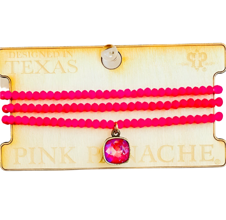 The Pink Panache Hot Pink Bracelet is a must-have for any stylish woman. This triple layer bracelet is adorned with micro-faceted hot pink beads and features a stunning 1cm Austrian crystal charm. Its stretchy design ensures a comfortable fit for all.