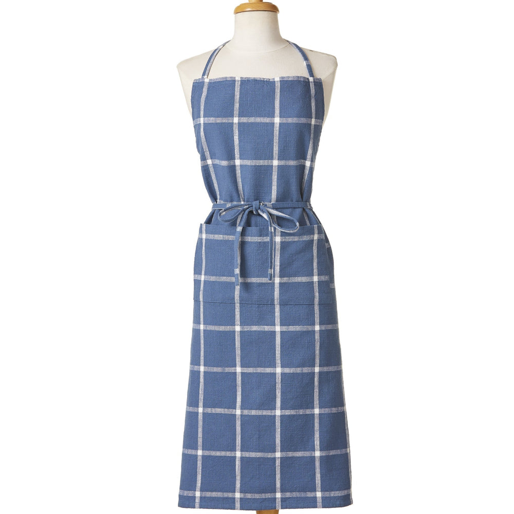 Protect your clothes from kitchen messes! Adding both function and style to typical kitchen tasks, this apron is made with 100% cotton and has a large pocket perfect for storing kitchen essentials while you work. Features include a yarn dye woven slub chambray weave in a checked pattern and adjustable slide-through ties. Enzyme washed for extra absorbency, softness and to reduce shrinkage. 37" in length.