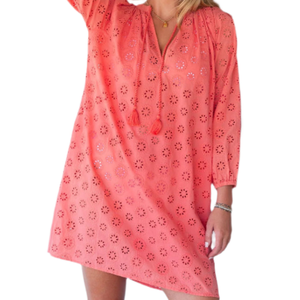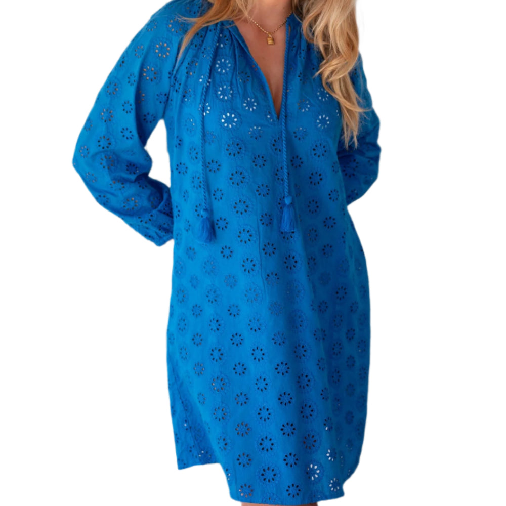 The Daisy Eyelet Cover Up is your passport to coastal elegance and poolside casual. This flirty eyelet coverup is adorned with delicate daisy-like patterns that evoke the essence of a perfect seaside excursion. Featuring three-quarter length billowing sleeves and tassels at the neckline. 100% cotton.