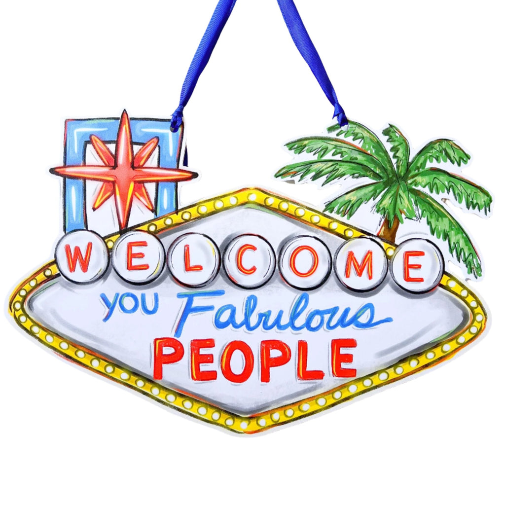 Welcome your fabulous guests with our version of the iconic Las Vegas "Welcome" sign as a door hanger! Waterproof and fade proof, this digital illustration by New Orleans' artist Kristin Malone is printed on a plastic board. 20" wide x 13" tall. Hangs approximately 19" tall with included ribbon.