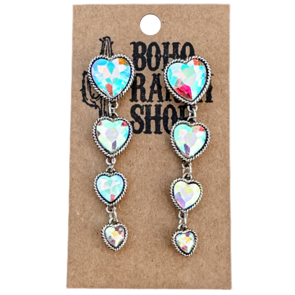 Introducing the Boho Ranch Glass Heart Dangle Earrings, designed for the chic western fashionista. These elegant earrings, featuring glass crystal hearts on dangle chains, add a touch of Valentine's Day flair to any outfit.