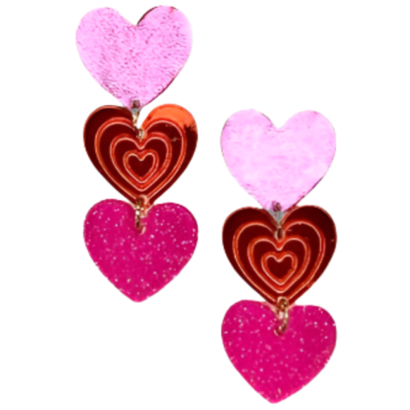 These Valentine earrings feature a dangling a trio of hearts of acrylic, leather look, and mirror finish. With a different style for each heart this pair is sure to dazzle. Approximately 2.5" in length.