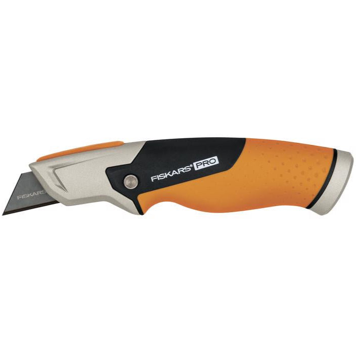 Keep your knife secure easily and simply with a Fiskars Pro Fixed Utility Knife, featuring a unique folding blade guard. This knife holds the blade securely and firmly so there's no wobble while in use. And, when you need to secure it, you can do so worry free with the press of a button that deploys the guard. The knife hinges open while a magnet holds the blade in place for easy blade change. There are no loose parts to disassemble so you can switch simply and quickly and there's onboard storage capacity for five fresh blades. A reinforced metal end provides reliable resistance against pounding and drops. Includes one CarbonMax utility blade that lasts 24X longer than standard utility blades. The Fiskars Pro fixed utility knife's folding blade guard deploys with the push of a button for convenient, easy protection. Durable construction. Easy to use.
