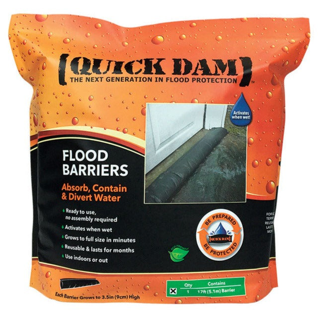 Quick Dam Flood Barrier absorbs, contains and diverts problem flood water. Activate when wet with no sand needed. The inner absorbent turns to gel and creates a barrier that blocks and diverts additional water. Grows to full 3.5" high in minutes. Can be stacked like a pyramid as needed. Attached smaller wedge prevents barrier from rolling out of position. Compact, lightweight and quick and easy to deploy. No more filling sandbags. Leave in place for months of ongoing protection. Not for use with salt water. Use for flood control, erosion control, ballistic protection, water removers, ballasts and more. Safe, non-hazardous & non-toxic. Environmentally friendly & decomposes over time.