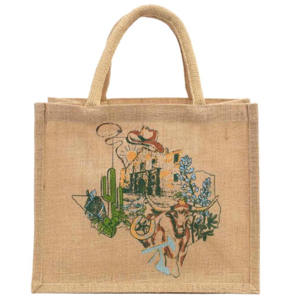 Gift totes are reusable by the recipient, feature a super cute design, and are spacious enough for whatever you are gifting. This all natural jute tote features a Texas-shaped print containing all the things we love about The Lone Star State! 12" x 10" x 8"