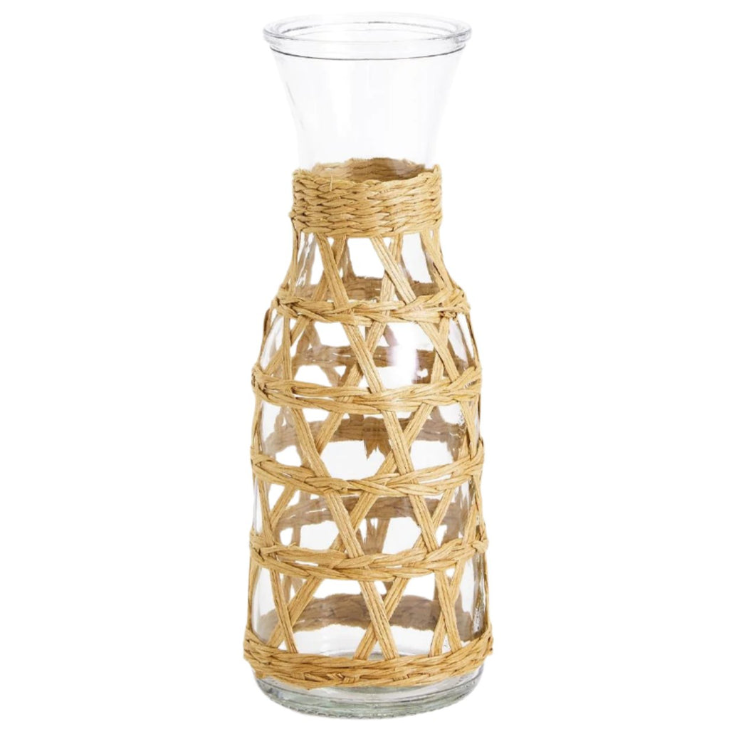 Fill your favorite beverages in this glass carafe. Features a hand-woven paper lattice yarn all around the glass giving it such a natural look. Holds 32 oz and great for serving at any party or gathering. Lattice not removable. 4" diameter, 10.75" tall.