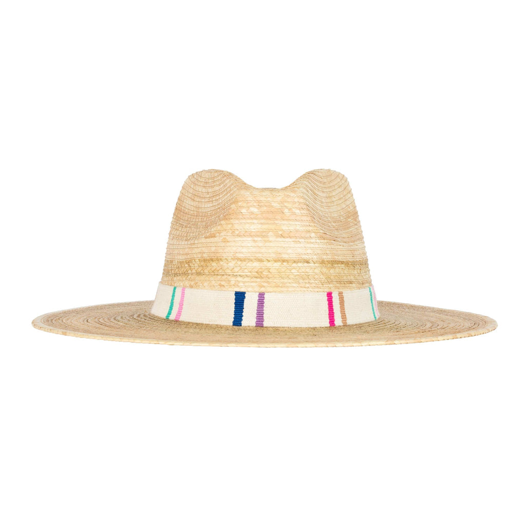 The Irma Palm Hat features a cotton woven band with colorful double stripes. Each one is handmade from palm fronds of the banks of the Chixoy River by our Guatemala female artisans.