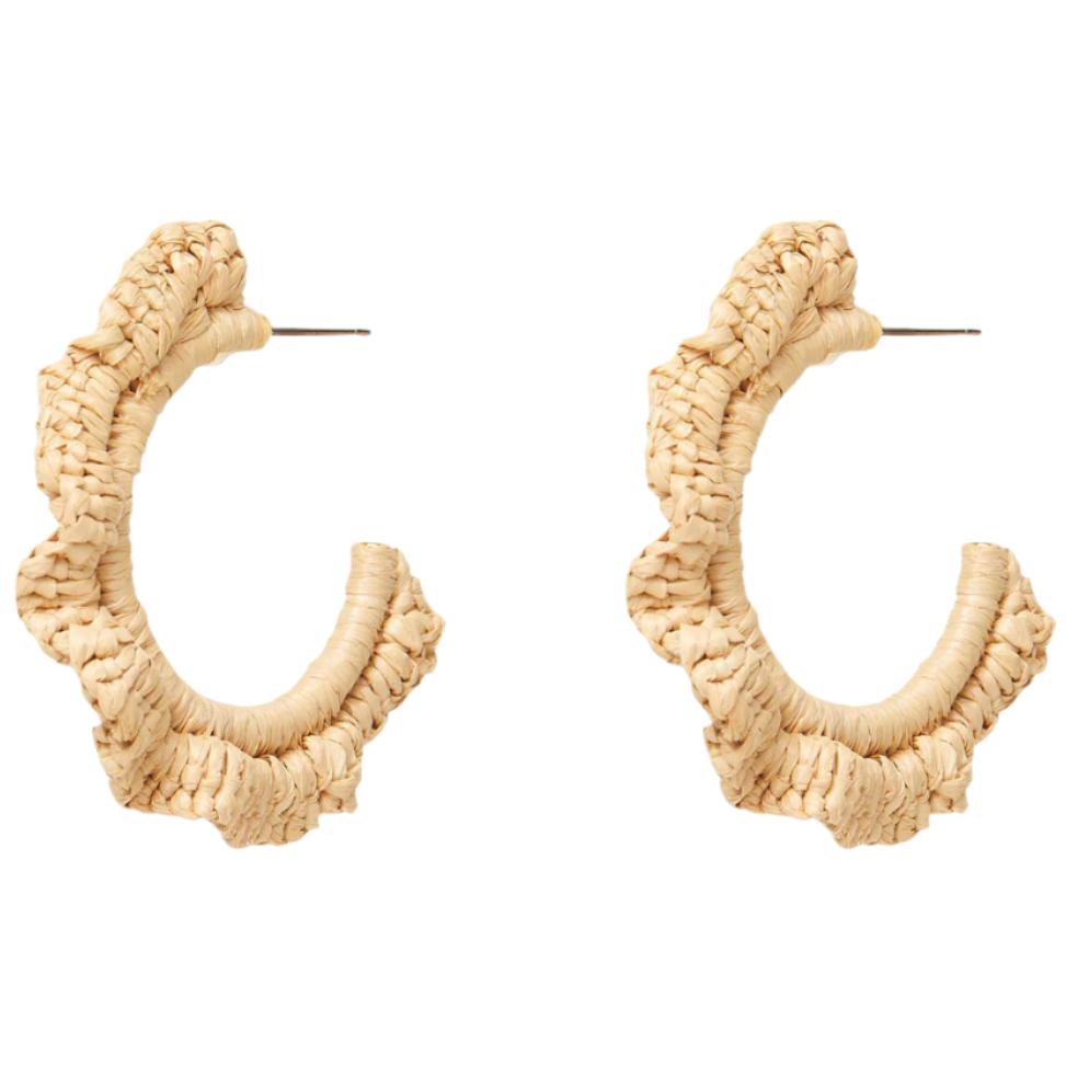 Lele Sadoughi's classic hoops now featuring natural raffia woven over 14K gold plated earrings. Lightweight and wearable from day to night. Surgical steel posts. 1.5" diameter.