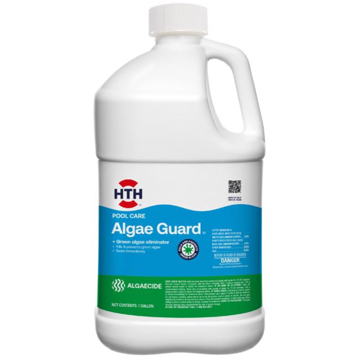 Stubborn algae can be caused by low chlorine levels poor water circulation or very warm weather. HTH Algae Guard 10 kills and prevents stubborn green algae for crystal clear swimming pool water. Simply add the non foaming fast acting formula directly to your pool water wait 15 minutes and dive right back in! HTH Algae Guard 10 is compatible with all swimming pool types.