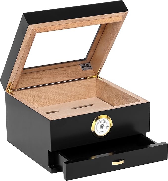 Designed with meticulous attention to detail, the Humidor Supreme Capri GlassTop features a reliable humidification system to ensure the optimal conditions for your cigars. The Spanish cedar interior enhances flavor profiles, while the exterior exudes sophistication. Equipped with a secure seal, the humidor effectively retains moisture, preserving the freshness and quality of your cigars. The hygrometer and adjustable dividers add versatility, accommodating various cigar sizes with ease. Whether you're a seasoned connoisseur or a newcomer to the world of cigars, the Humidor Supreme Capri GlassTop is a must-have for those who appreciate the finer things in life.