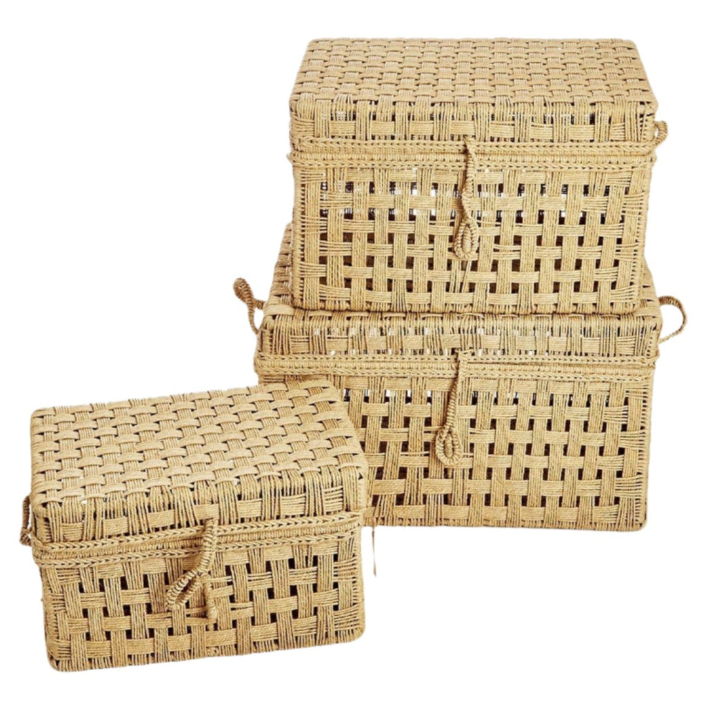 Crafted with meticulous attention to detail, each trunk embodies the unique beauty of handcrafted artistry. Made from high-quality jute intertwined with durable iron accents, these trunks offer both style and durability.
