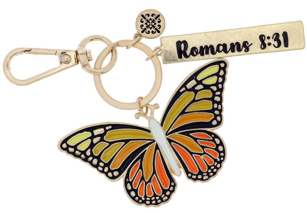 Introducing the "Romans 8:31" Butterfly Bar Keychain from Jane Marie, a brand known for its women's accessories. This 2" pendant keychain is not just an accessory but a statement. Ideal for personal use or as a thoughtful gift, this keychain stands out with its unique design.