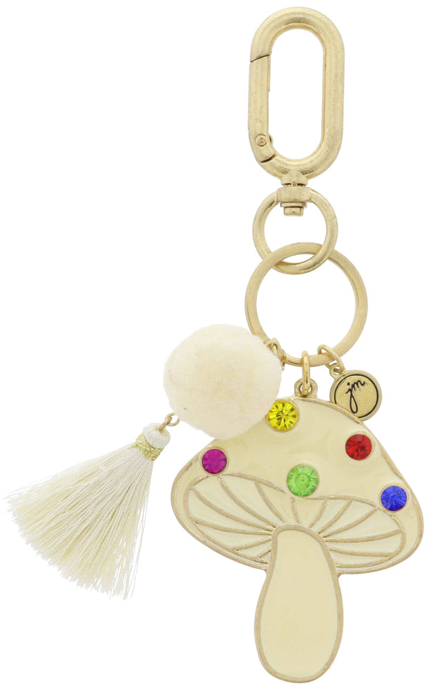 Add a touch of whimsy to your keychain with the Jane Marie Spotted Mushroom & Tassel Keychain. Crafted with a 2.25" x 2.5" ivory white enameled mushroom, this keychain features colorful spots and a matching frilly ivory tassel. Perfect for adding a pop of fun to your keys.