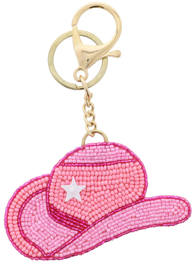 Immerse yourself in the vibrant charm of the Pink Beaded Cowgirl Hat Keychain by Jane Marie. This accessory is not just a keychain, it's a statement piece. Crafted with a blend of pink beads and topped by a white sequin star, it measures 2" from top to bottom. Ideal for the fashion-forward woman, it can add a splash of color and sparkle to your everyday essentials.