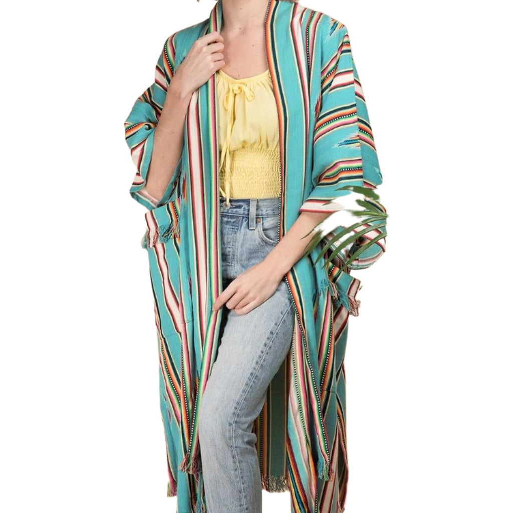 The long silhouette of our colorful Aztec-inspired kimono is comfy and breathable. As an added bonus, this piece has two deep pockets on either side. 27" x 44". Made in India.