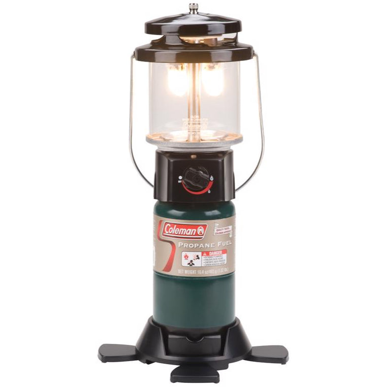 Reliable, extended-run outdoor illumination can be yours with the Coleman Deluxe Propane Lantern. The 2-mantle design of this lantern creates a steady, bright glow of up to 1000 lumens of light that reaches up to 23 meters away. A quick match strike is all you need to get your lantern started, then simply dial in the perfect brightness with the adjustable control knob. Once your lantern is lit, the footed base provides stability when placed on a table and the bail handle allows for easy hanging. No matter where you go, the PerfectFlow pressure control technology produces a steady fuel stream and consistent performance in all kinds of weather. When you're ready to head home, the feet on the base collapse for more compact storage until you're ready for your next bright adventure. Lasts up to 7.5 hours on high or 13 hours on low on one 16.4 oz Coleman propane cylinder (sold separately).
