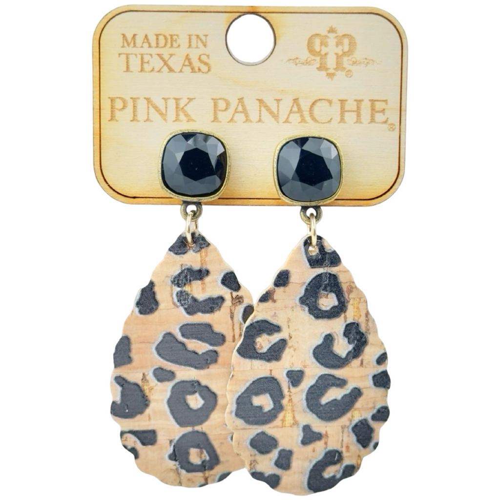 This earring has a custom bronze post setting with a set-in 10mm black Austrian crystal. A leopard pattern cork teardrop hangs below. The earrings are approximately 1.75" in length.