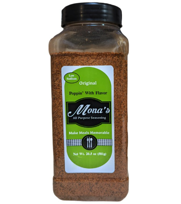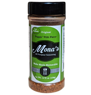 Mona's All-Purpose Seasoning makes every dish pop with flavor! Try it on everything from grilled vegetables to steaks and seafood. Goes great on scrambled eggs and other breakfast staples to start your day off with a kick. Makes a great rub or add it to a flour batter to fry up some real soul food! Always low in sodium and available in an original blend and two levels of spiciness.