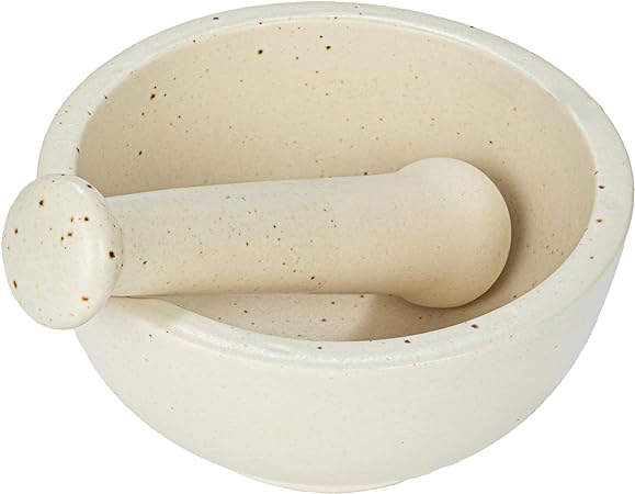A round stoneware mortar and pestle with a white color and a smooth texture, ideal for grinding spices, herbs, nuts, or garlic. A simple and classic piece that can fit various decor styles, such as farmhouse, French country, modern, boho, or Scandinavian. Can be used to prepare sauces, dips, marinades, or dressings, or as a decorative item or a gift. Made of stoneware, these mortar and pestle are durable, easy to clean, and resistant to stains and odors. Measures 8" in diameter and 3" in height.