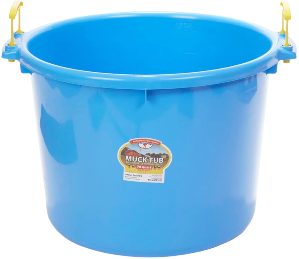 The Little Giant Muck Tub bucket is made of tough polyethylene resin that is impact resistant, protects against warpage, and helps prevent stress cracks. This premium utility bucket works great for pet and livestock feeding, but it can also function as a storage bucket or for transporting waste. Features two strong plastic handles built into the rim. 21.75" diameter by 17.25" tall. Internal volume of 70 quarts (17.5 gallons).