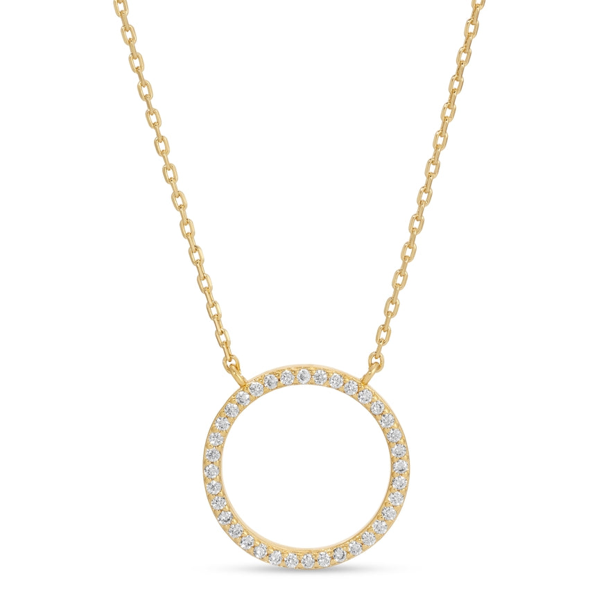 This open pave circle pendant necklace is the perfect addition to any outfit. Made with plated brass and sparkling cubic zirconia, it adds a touch of elegance and sophistication. With its 16" length, it is suitable for any woman who wants to make a statement.