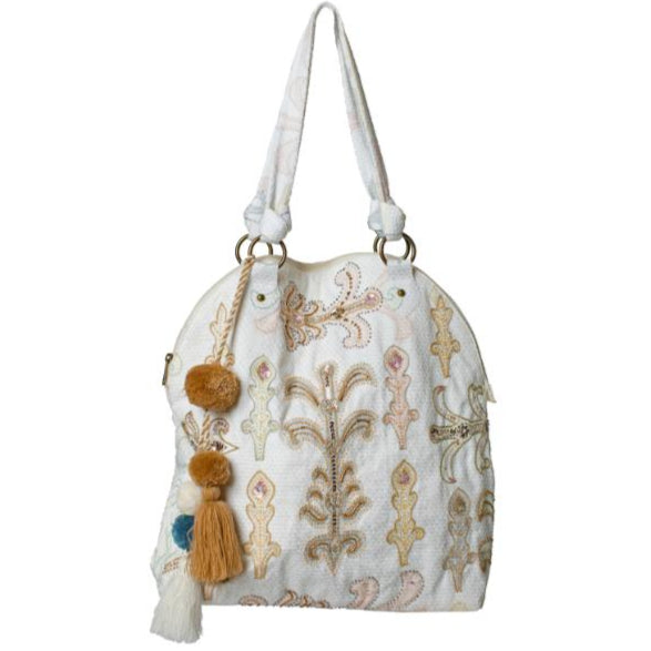 The Jane Marie Natural Beauty Tote combines durable 100% natural cotton with a smooth polyester lining for reliable everyday use. Its white canvas is adorned with expertly embroidered earthy-toned designs, complemented by two decorative pom-pom tassels for a stylish touch. The secure zipper closure ensures your belongings stay protected, while the spacious 17" x 18" x 5" dimensions provide ample room for essentials. This tote offers both functional reliability and refined aesthetic appeal for those seeking a versatile accessory.