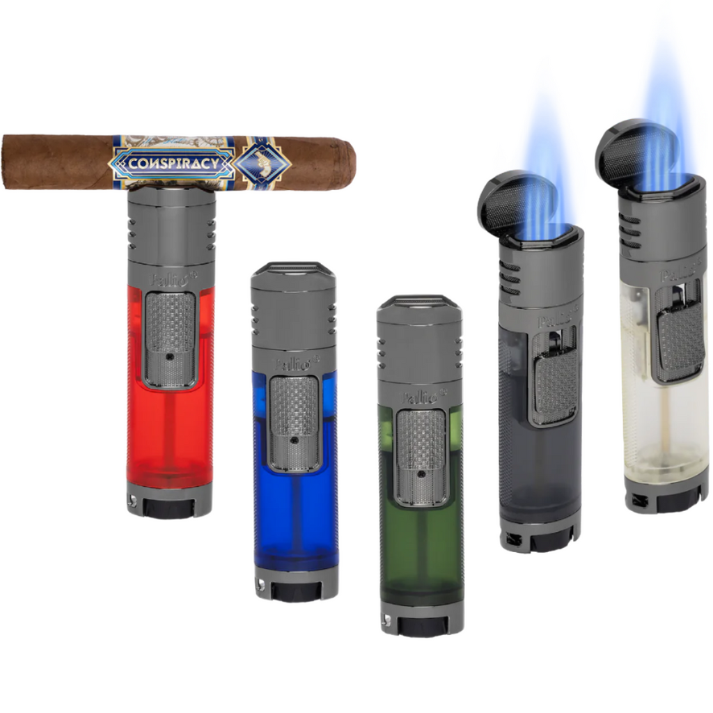 The Veneto by Palio is a hardy quad jet lighter featuring an extra large high capacity fuel tank capable of lighting up to 150 large-ring cigars before needing a refill. The quad jets produce an adjustable elongated diamond-shaped flame, when not in use the jets are protected by a replacable cap. Features an ergonomic shape for a secure grip as well as a lanyard hole for tethering. Altitude tested to 14,000 feet. Approximately 5.5" tall and 1.5" in diameter.