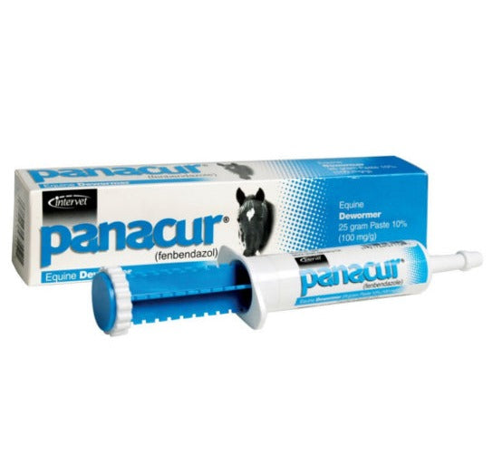 Panacur Dewormer for horses is an easy paste application of Fenbendazole (25g). This equine deworming paste comes in a single dose oral syringe. It eliminates small and large strongyles, pinworms, and roundworms. The paste is apple and cinnamon flavored to make the formula palatable for horses.