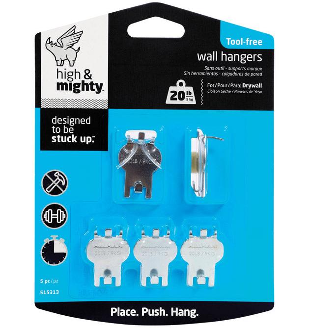 High & Mighty wall hangers are easy to install without a single tool -- simply place, push, and hang! With just your thumbs you can quickly go from inspiration to installation. Pictures, mirrors, wall decor, or even a gallery wall go up in seconds, and removing or replacing High & Mighty is easily done with a flathead screwdriver or something similar. Five pack of hangers, 20 lb capacity.