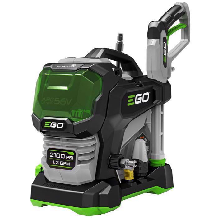 The EGO Power+ HPW2100 pressure washer delivers up to 2100 PSI and up to 1.2 GPM for powerful and efficient cleaning. It's lightweight and portable, with the ability to connect to a garden hose or draw from a fresh water source like a bucket when used with its included siphon hose for fully cordless cleaning. The cordless pressure washer offers convenient onboard storage for its nozzles and hoses, and quick-connection points for hoses and wand allow easy setup and quick nozzle changes. This cordless electric pressure washer allows you to switch between three modes: Eco, High, and Turbo. It delivers up to 30 minutes of runtime on a single charge with a recommended 6.0Ah ARC Lithium battery (sold separately). The power washer comes with a flexible 25' high-pressure hose, siphon hose with filter, quick-connect short pressure washer gun, stainless steel wand, 15-degree nozzle, 25-degree nozzle, 40-degree nozzle, turbo nozzle, and foam cannon.