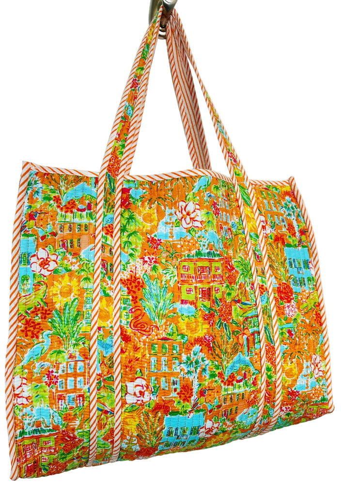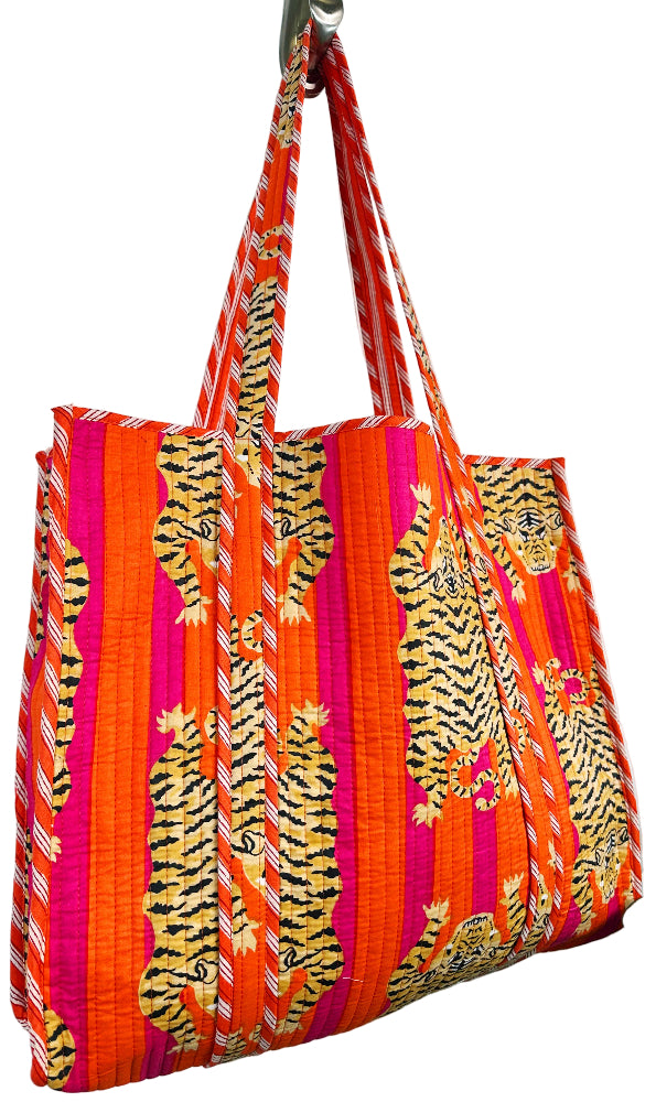 Folklore Couture's oversized reversible quilted tote featuring vibrant block printing. Perfect as a market tote, beach bag, weekender, and much more! 17.5" with interior pocket. Handmade in small batches in India, prints are very limited. Due to the handmade nature of these bags the printing pattern may vary between bags.