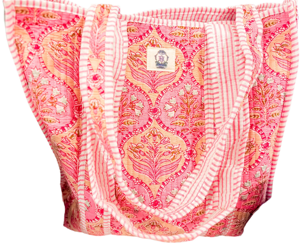 Each Heart of Grace cotton tote is created with a combination of block printing process and hand-stitched seams to achieve their quilted look. They are printed and handmade in India. Features a spacious interior with inside pockets for phones, coin purses, and other essentials.