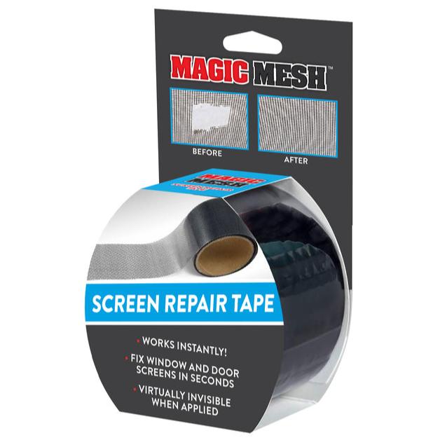Fix any screen tear instantly with Magic Mesh Screen Repair Tape, a strong screen adhesive usable for tear repair on all screen surfaces. No tools needed. Just cut to the size you want and stick to the tears or holes. Fix window screens, screen doors, tent mesh, pool screens, RV screens and more. 9 foot roll, 2 inches wide.