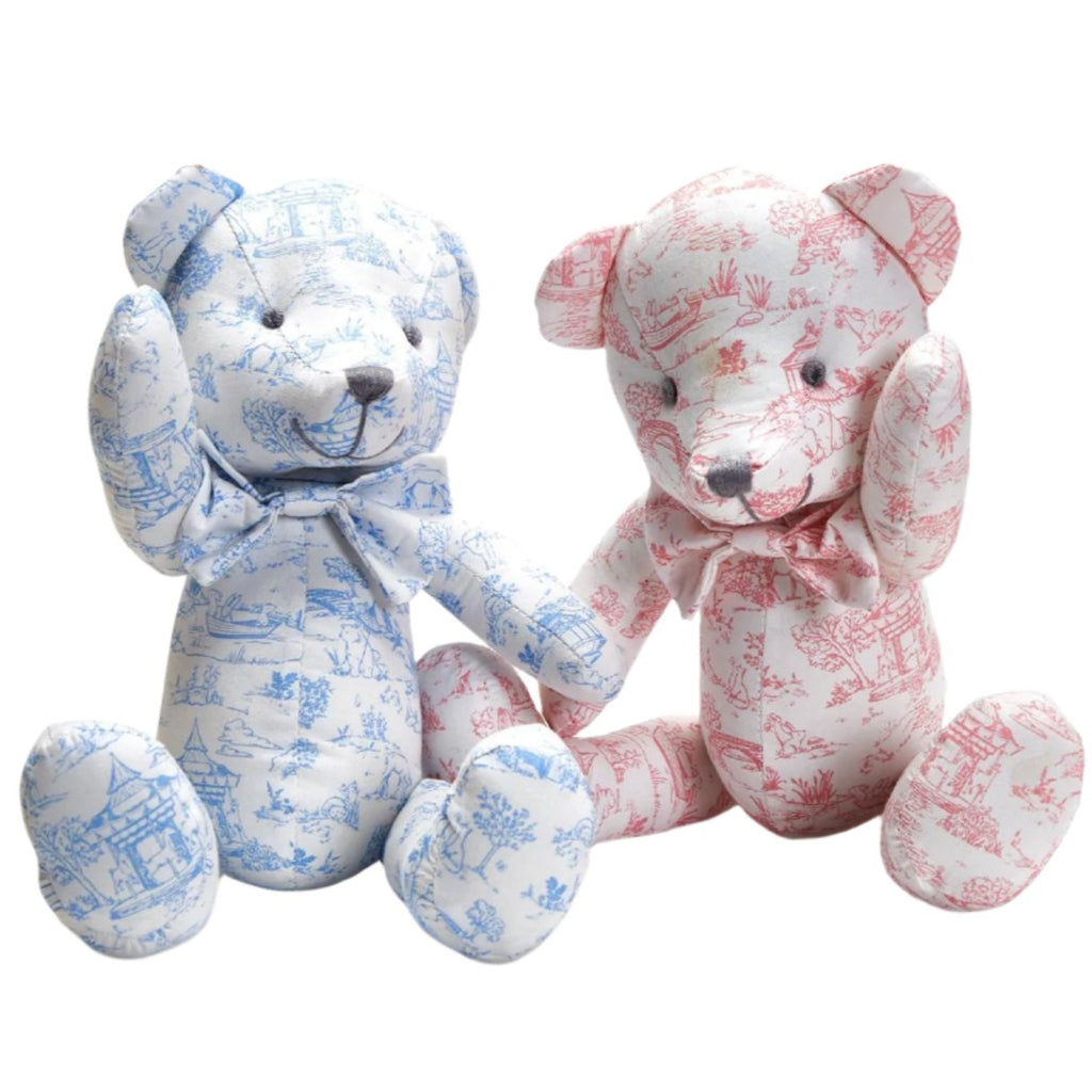 A charming companion that brings the elegance of animal toile patterns to cuddly life. This teddy bear features a timeless and intricate pattern, coupled with movable arms and legs that invite play and creativity. Offered in two colors for boys and girls, recommended for ages 18 months and up.