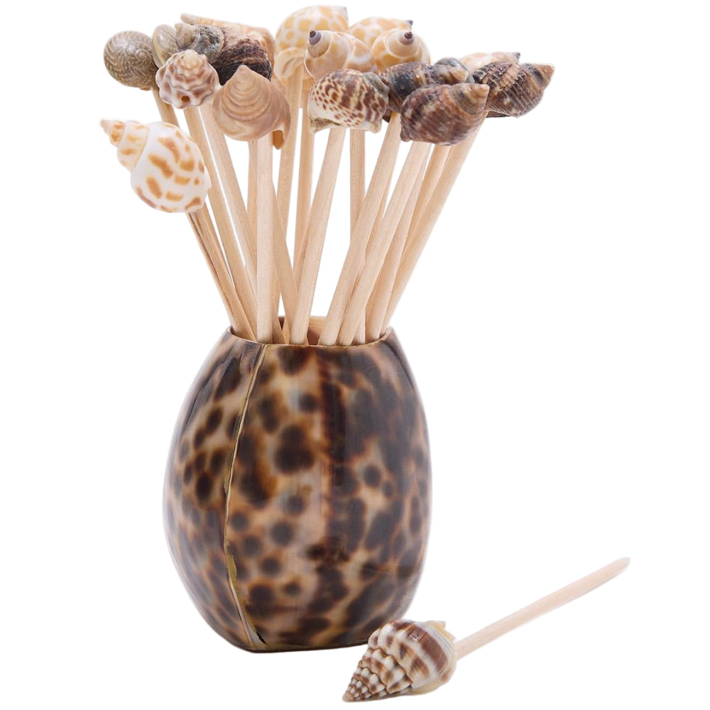 Transform your dining experience into a coastal oasis with our unique Tiger Cowrie Shell holder, accompanied by 20 assorted sea shell picks. Bamboo wood picks are adorned with intricate shells featuring natural beauty and charm. Perfect for adding a touch of coastal to your home decor, whether displayed on a mantel, bookshelf, or coffee table.
