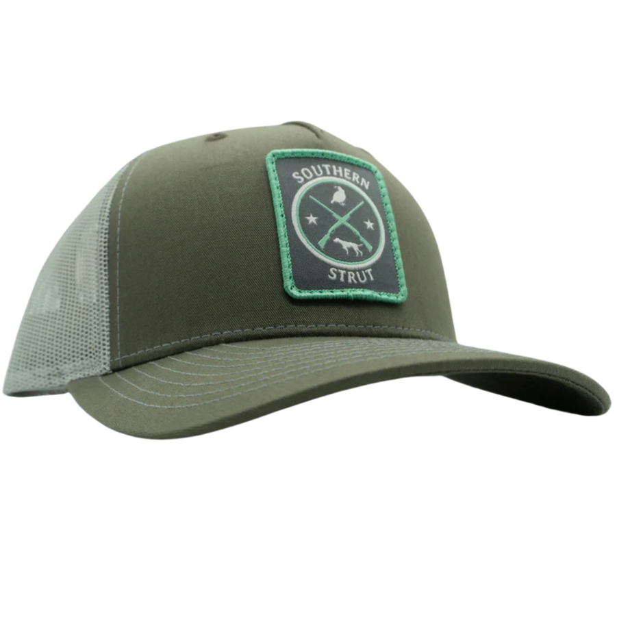Stay stylish in the great outdoors with the Southern Strut Quail & Pointer Patch Hat. This gray trucker-style cap features a stunning gray, teal, and white patch featuring crossed rifles, a quail, and hunting dog - celebrating the thrill of the hunt. With its mesh back and adjustable snap closure, this hat provides a breathable and customizable fit for all-day comfort.