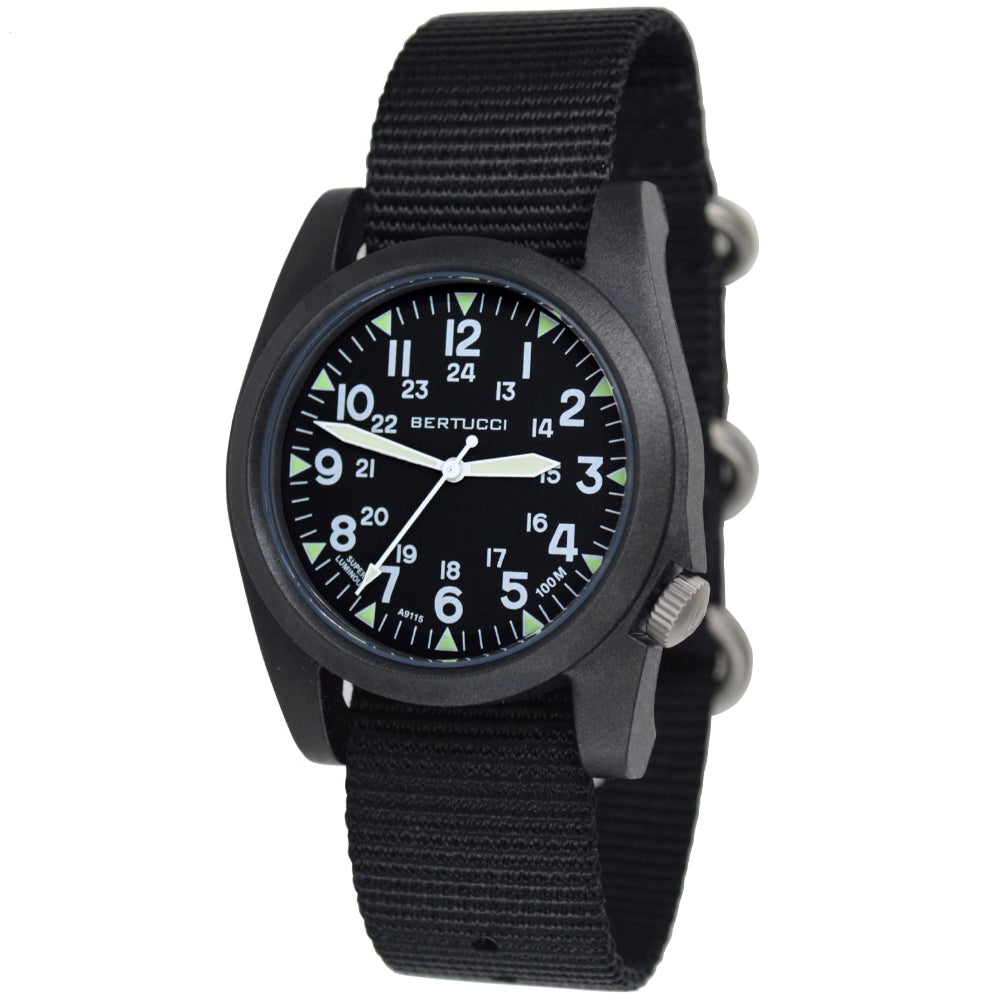 The A-3P Sportsman Vintage Field Watch is inspired by classic American field watches that embody the spirit of adventure, function, ruggedness, and sensible value. The result is a combination of refinement and versatile style in Bertucci's 42mm patented Unibody fiber-reinforced case. Built for performance, function, lightweight comfort and long-lasting durability.