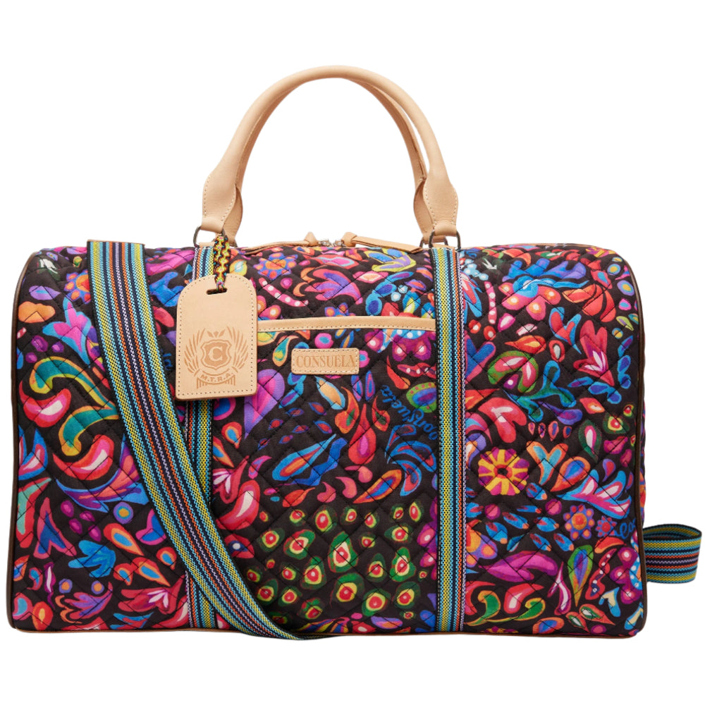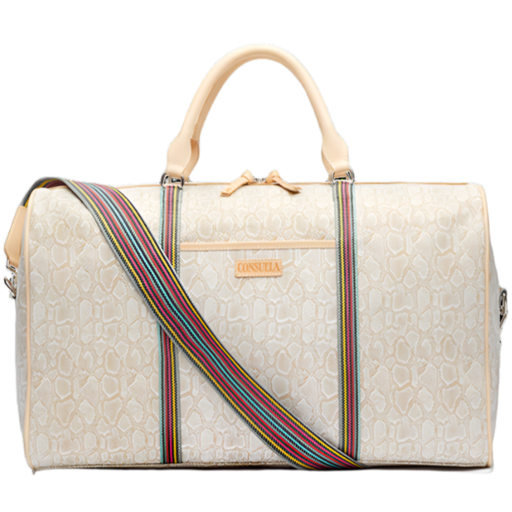 Our largest duffel style, the Weekender, is our go-to for weekend road trips. This duffel bag is roomy enough for all your essentials and features leather handles, an adjustable webbing strap, two interior pockets, and two exterior pockets. The opening of the bag features a double-zipper design to keep your belongings safe and secure. Measures 22” x 13.5” x 9” with a 4.75" handle drop and 3.5” - 17.5” adjustable crossbody strap drop.