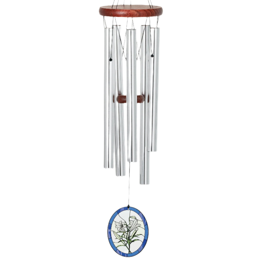Tuned to a pentatonic scale commonly used in Asian music and American Folk Songs, this stunning decorative chime evokes the beauty of stained glass, an interplay between light and color. UV is a versatile printing process that combines ultra-violet light and special inks. This unique technique allows us to print intricate designs and textures on a variety of materials. Mahogany-finish ash wood, stained glass effect on acrylic.